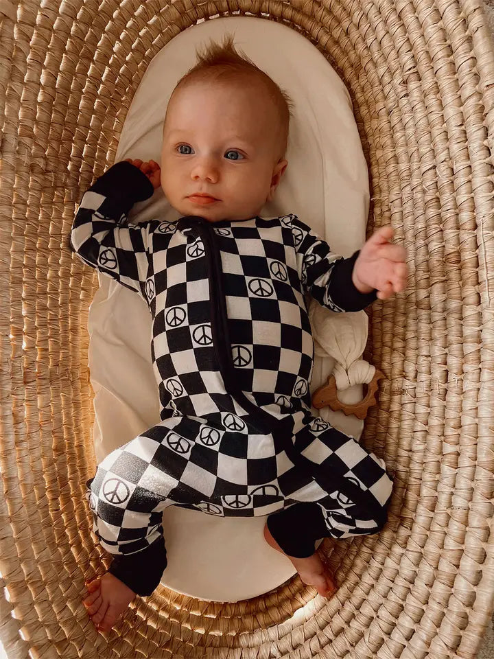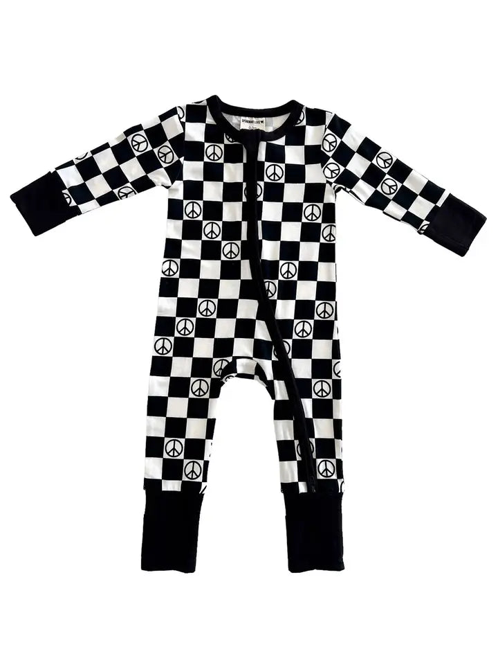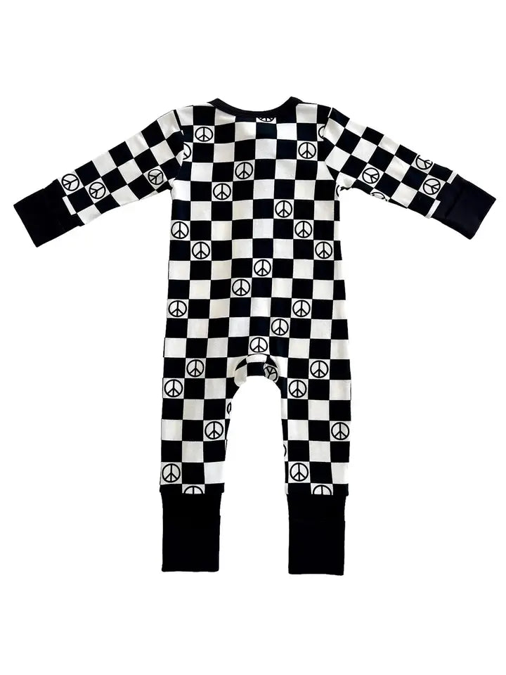 2-Way Convertible Zip Romper, Black Peace Checkerboard