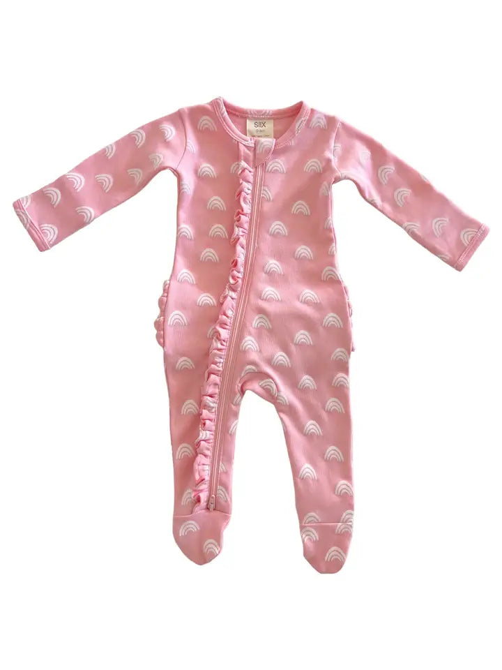 This sweet rainbow print is perfect for your little one. Add the frill on the classic baby footie, and you’ve got the ultimate sweet and feminine look. The Organic Frill Zip Footie features soft 100% GOTS Certified Organic Cotton, a zipper for easy changing, and darling frills along the zipper and bottom. Made in India