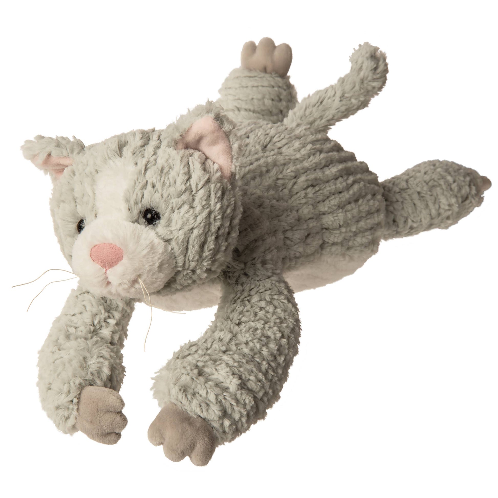 Cozy Toes Kitty in fluffy grey and white fabric, paws are soft trimmed fabric; features perky ears, a soft pink nose, and whiskers. Measures approximately 17-inches.