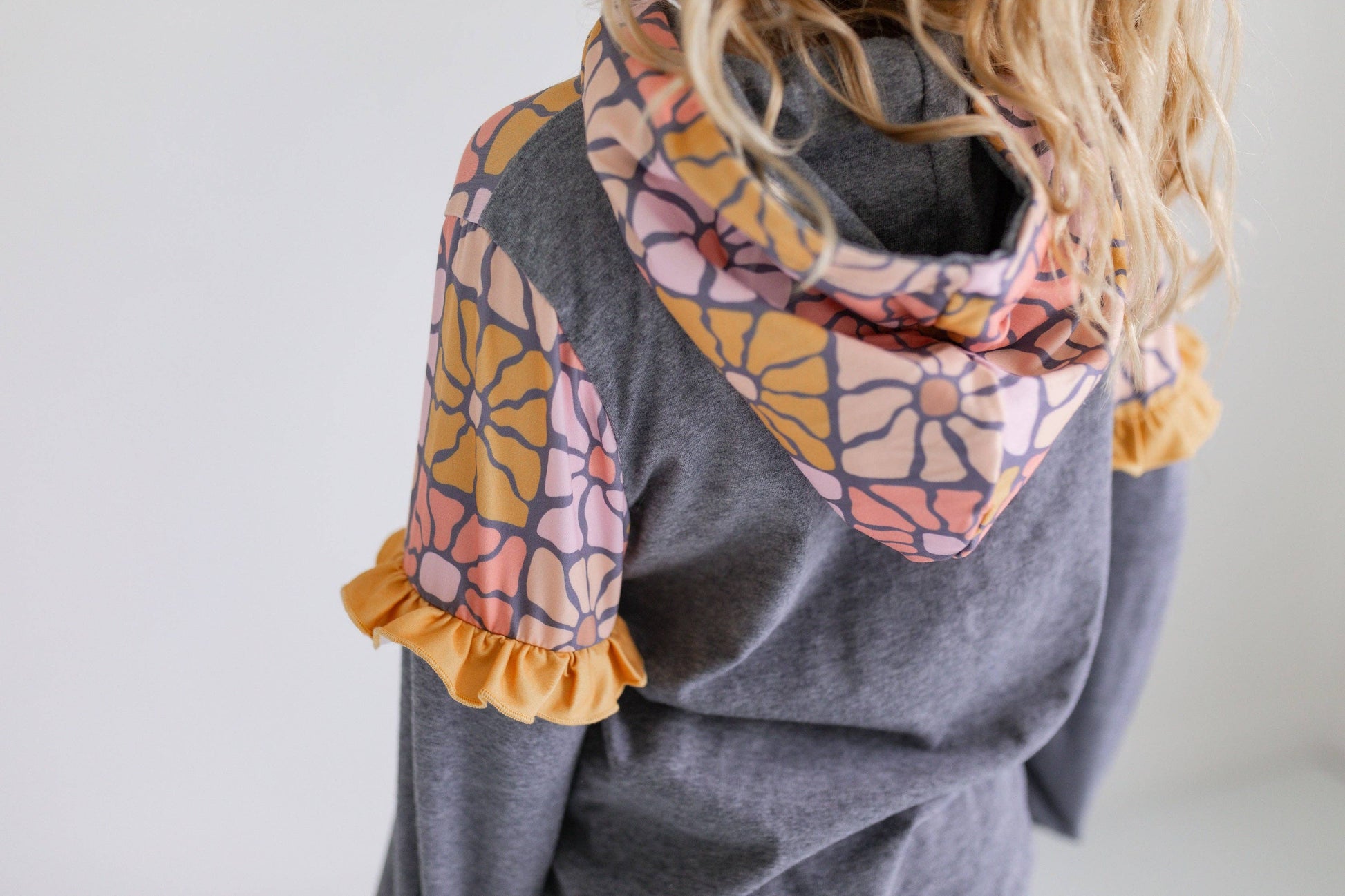 Girls two piece set includes Gray, Mustard & Pink floral print ruffle hooded top with mustard ruffle trim. Gray sweat pant lounge pants with mustard ruffle trim. A great outfit for back to school and the Perfect loungewear for snuggly Fall and Winter Days!