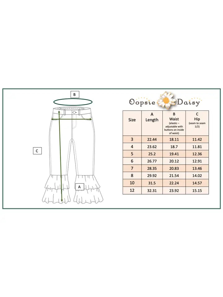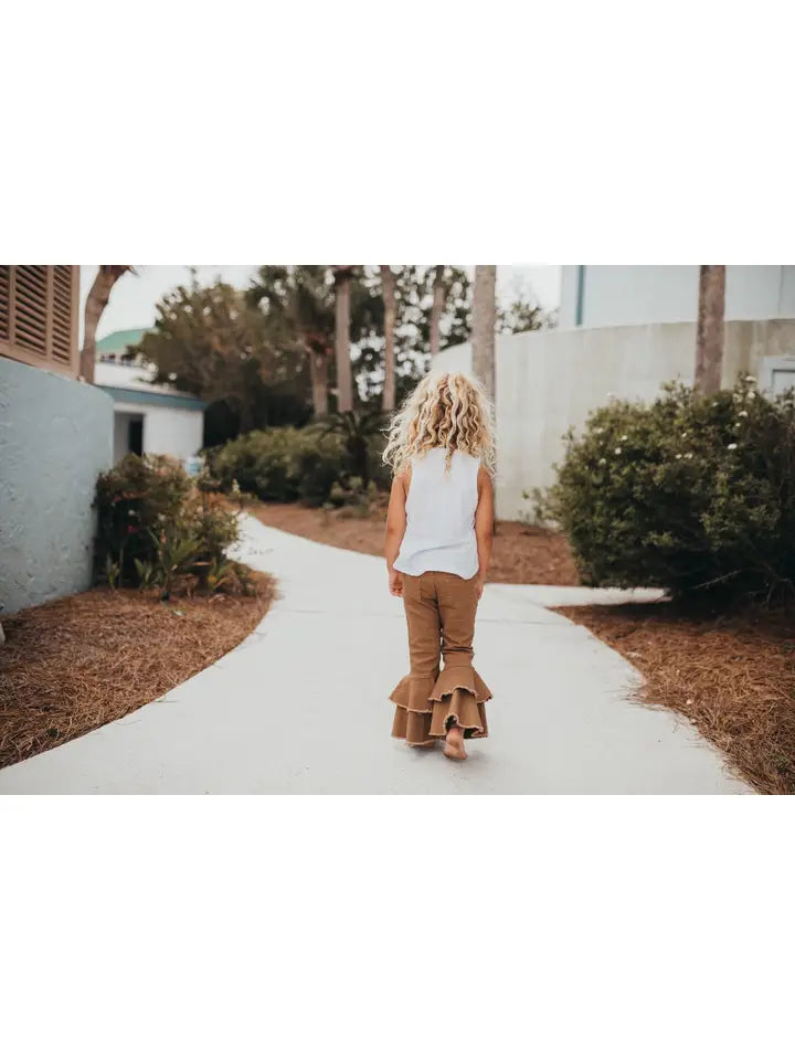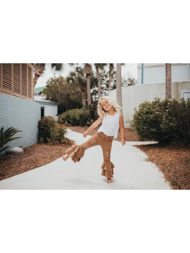 Girls Adorable khaki denim jeans with super fun double ruffle detail. Button and zipper front with elastic adjustable waistband. Cute western wear for young cowgirls!