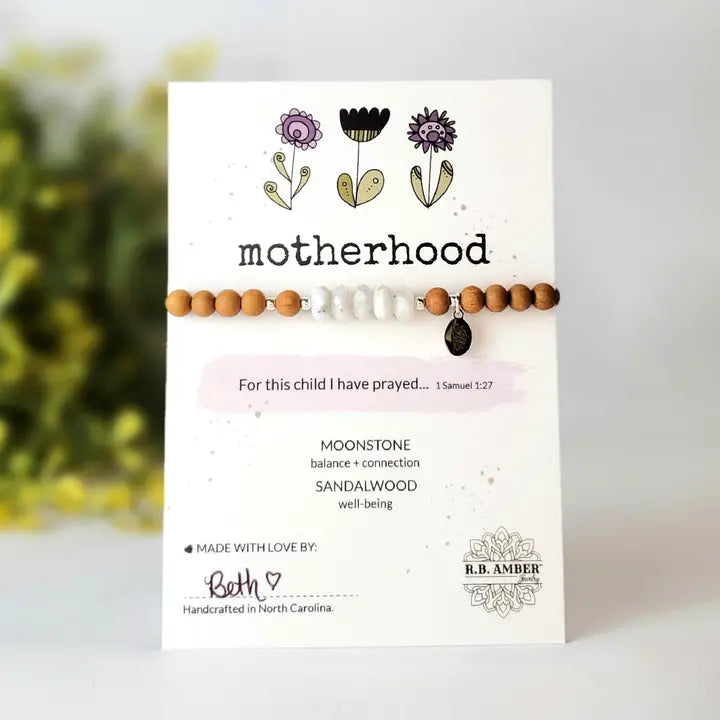 "For this child I have prayed...." 1 Samuel 1:27 This beautiful handcrafted bracelet from our Faith + Love Collection was designed to honor and celebrate the beautiful gift of motherhood. ✨ Created using 8mm faceted rondelle genuine gemstones + 6mm sandalwood beads + sterling silver accents. ✨ Features Moonstone for balance + connection along with Sandalwood for well-being. Our Faith + Love Collection is made in partnership with "The Abandoned Widows of Vrindavan, India," who lovingly handcraft each sandalwood bead. Your purchase empowers them by providing jobs, hope and love. Thank you to Mahima Creations for allowing us to come alongside these women and show some love to our neighbors. Handmade on premium stretch cord for easy on and off. Handcrafted and lovingly packaged in North Carolina by our small team of women.