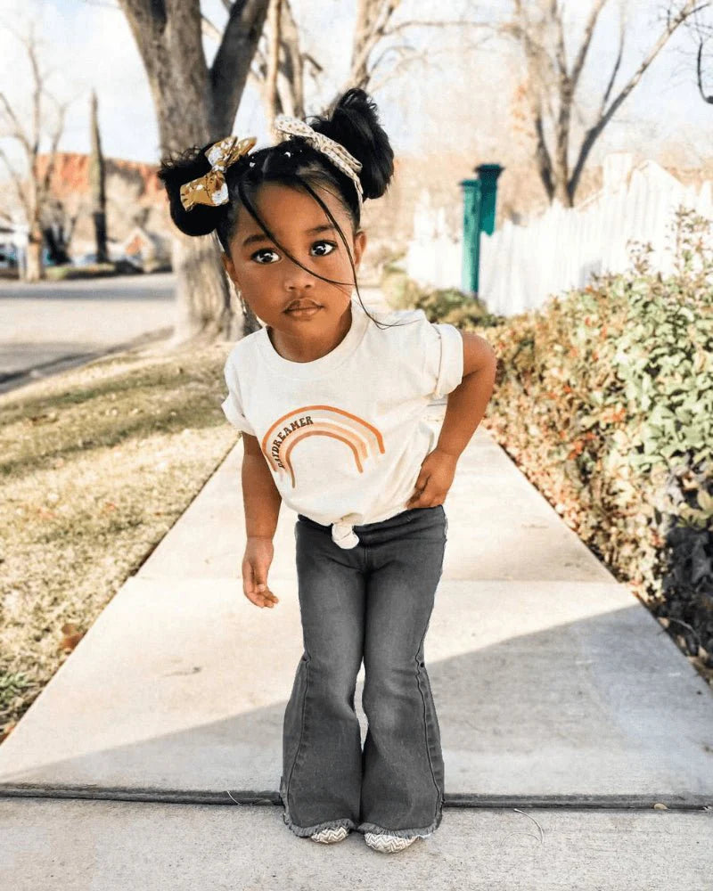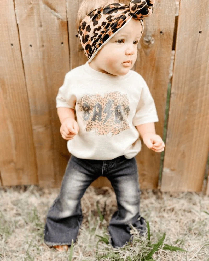 Retro, BB! THE classic bell bottoms are here and they are your new favorite staple! Pair with a Maggie Cap Leo, graphic tee, or cute BB top to bring your mini's style to the next level. This black wash denim style has an elastic band to make it an easy and comfortable must-have!