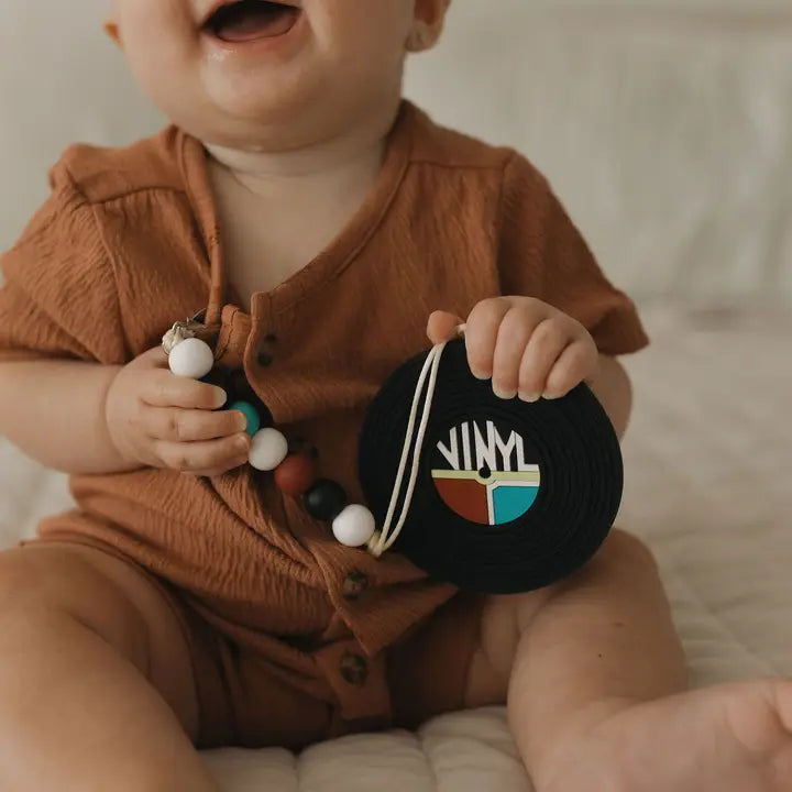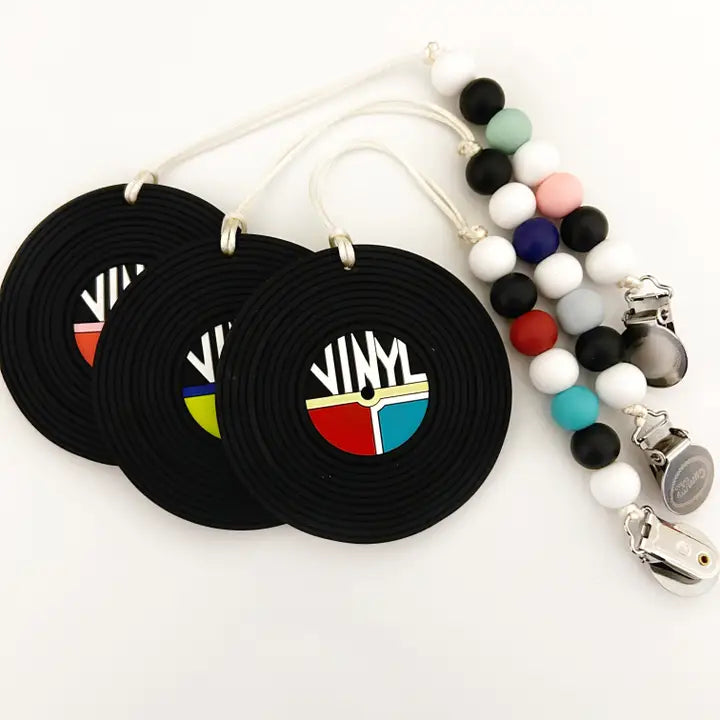 Another Gummy Chic exclusive design, our Vinyl Record silicone baby teether. This teether has a nostalgic yet modern feel to it and it goes very well with our retro teether line. These vinyl Record silicone teethers are not only for the baby to use, chew, and practice hand-eye coordination but also a fun keepsake for the parents. Choose between the three colored labels that will make the best original baby gift to new parents! These teethers can be used by babies and older kids, teens or adults who are oral sensory seekers and with sensory needs. As with all of our Gummy Chic teethers these are BPA FREE, phthalates FREE, cadmium FREE, lead and heavy metals FREE. NO smell, NO taste. 100% food grade silicone. The all silicone and plastic clip is a safer alternative to the beaded clips without losing its visual appeal, equalling attracting many parents and babies. The entire teether and clip is an original Gummy Chic design. Teether measures a diameter of 3.7"